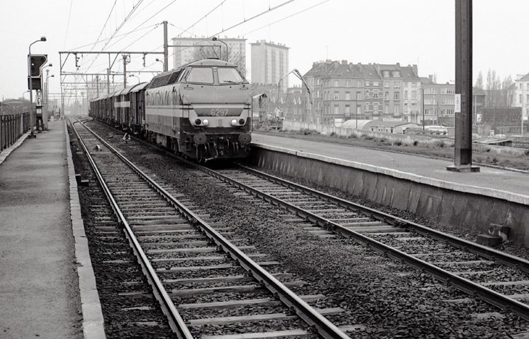 TitelDiesellocomotief 6297 met gesloten wagens te Brussel-West