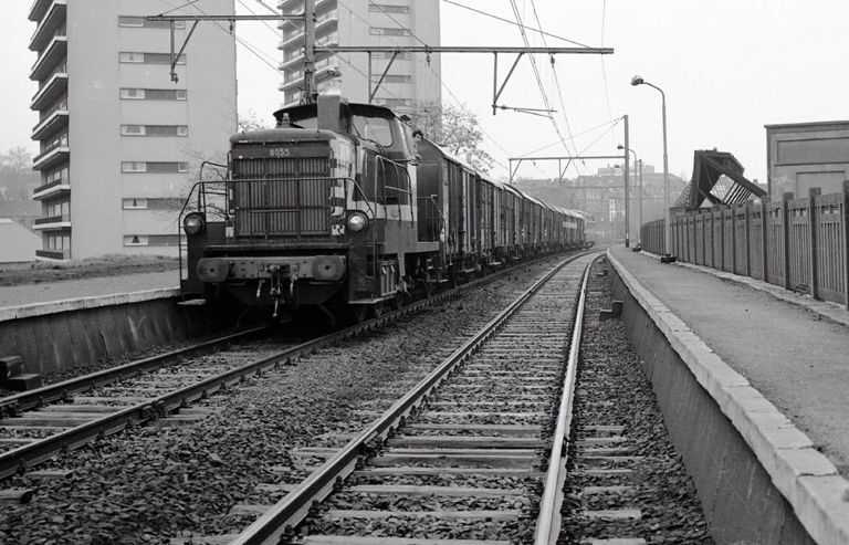 TitelDiesellocomotief 8055 met gesloten wagens te Brussel-West