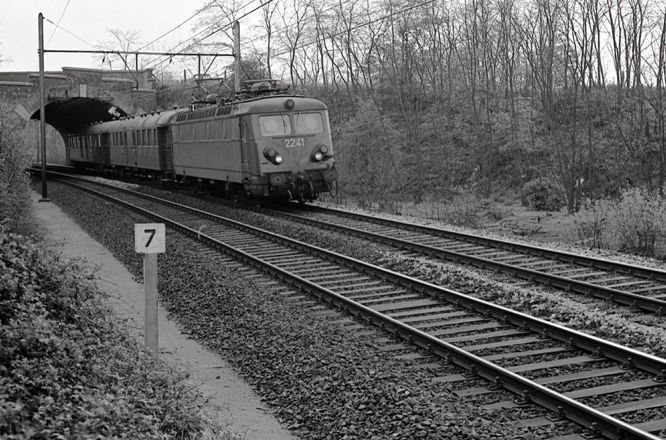 TitelElektrische locomotief 2241 met K-rijtuigen in Drogenbos