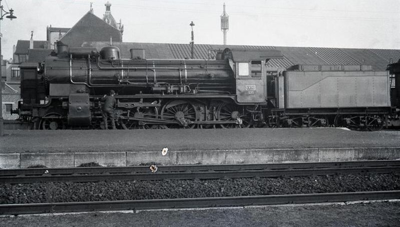 We zien stoomlocomotief 6436 van het type 64 (2C Ten Wheel) in het station Schaarbeek. Zij staat klaar aan het perron om de reizigerstrein 1235 te slepen. Deze locomotief heeft een ACFI-voorverwarmer, en is gekoppeld aan de tender nr. 22.291.