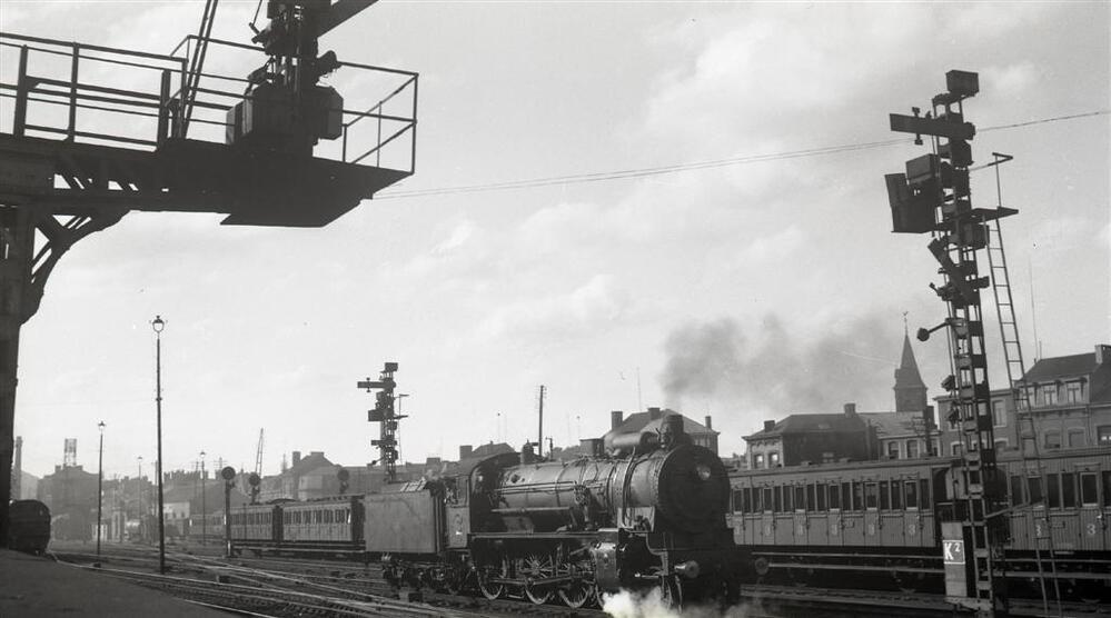We zien stoomlocomotief 6537 van het type 64 (2C - ten Wheel) in het station Luik-Guillemins. Deze locomotief is uitgerust met een ACFI-voorverwarmer. Bemerk de mechanische seinen van het type K2. In de achtergrond zien we GCI-rijtuigen staan.