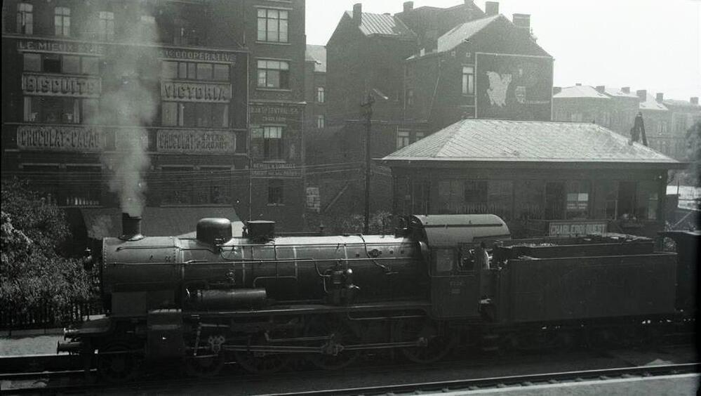 We zien stoomlocomotief 6554 van het type 64 (2C - ten Wheel) in het station Charleroi-West. Deze locomotief, niet uitgerust met een ACFI-voorverwarmer, maar eentje van het KNORR-type staat voor de seinpost. Zij zal de reizigerstrein met nr. 699 slepen. Bemerk de talrijke reclamepanelen die op de huizen aanwezig zijn.