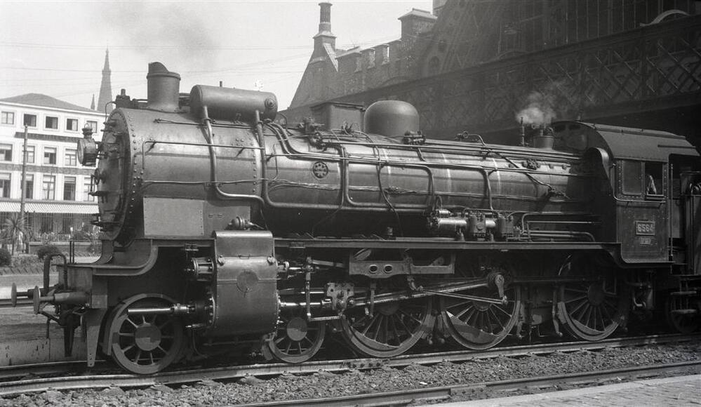 We zien stoomlocomotief 6564 van het type 64 (2C Ten Wheel) in het station Brugge. Deze locomotief is uitgerust met een ACFI-voorverwarmer. Zij staat klaar aan het perron buiten de overkapping en zal de reizigerstrein met nr. 3037 slepen. In de achtergrond zien we het stationsgebouw van Brugge.