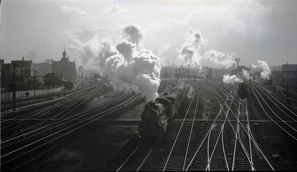 We zien stoomlocomotief 6521 van het type 64 (2C - Ten Wheel) in de bundel van het station Schaarbeek. Deze locomotief, uitgerust met een ACFI-voorverwarmer, sleept de reizigerstrein met nr. 638. De trein is samengesteld uit M 1-rijtuigen. Links op de foto zien we nog het stationsgebouw van Schaarbeek, en rechts nog enkele andere stoomlocomotieven.