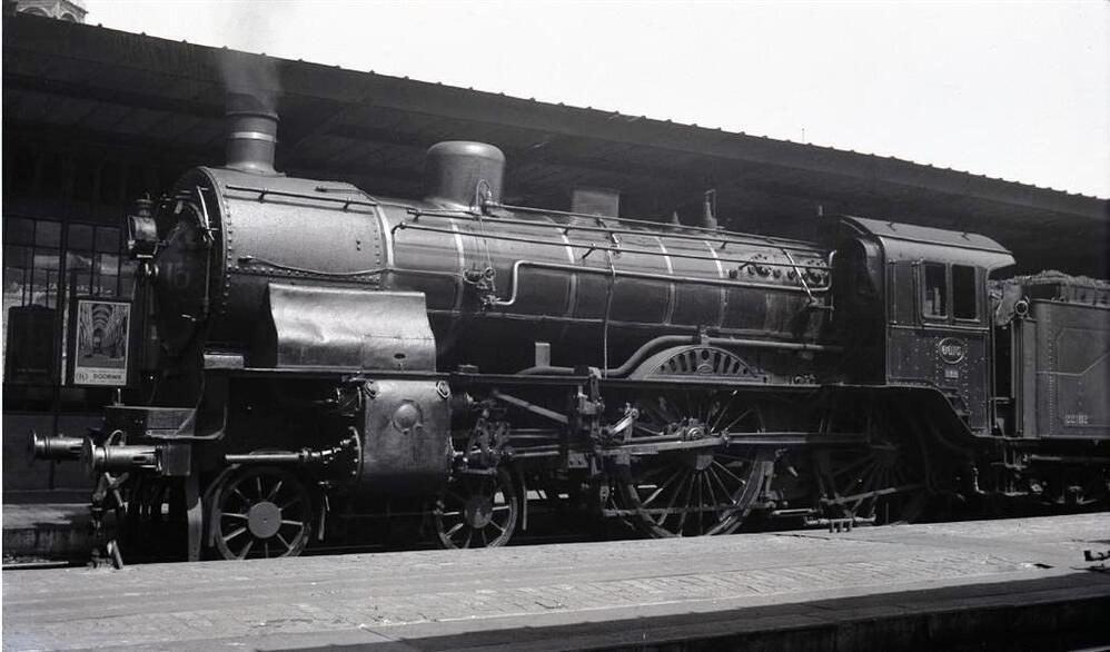 We zien stoomlocomotief 6615 van het type 66 (2B - American) in het station Gent-Sint-Pieters. Deze locomotief is gekoppeld aan de tender met nr. 22.312. Op het perron ziet men een affiche met reclame voor Doornik.