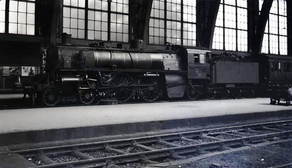 We zien stoomlocomotief 6910 van het type 69 (2B1 Atlantic) in het station Antwerpen-Centraal. De locomotief, zonder ACFI-voorverwarmer en leiplaten, staat onder de perronoverkapping met de reizigerstrein nr. 235.