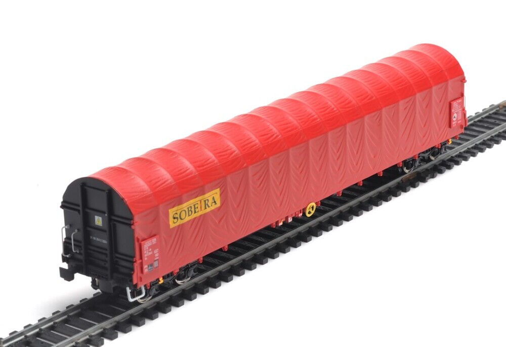 Zwarte platte wagen op draaistellen met rode huif en zwarte kopwanden. Op de zijkanten staan verschillende opschriften, zoals het identificatienummer, de lettercode Rils, het typenummer 3514H4 en 'Sobetra'. De maquette is op schaal H0 1/87 vervaardigd.