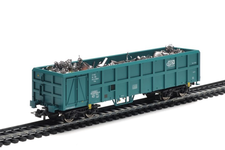Groene stortwagen van B-Cargo. Deze wagen heeft aan beide zijkanten een deur om de goederen makkelijker uit te storten. Er staan verschillende opschriften op de zijkanten, zoals het identificatienummer, de lettercode Fas en het typenummer 1415G5. In deze wagen worden stukken metaal vervoerd. De maquette werd op schaal H0 1/87 vervaardigd.