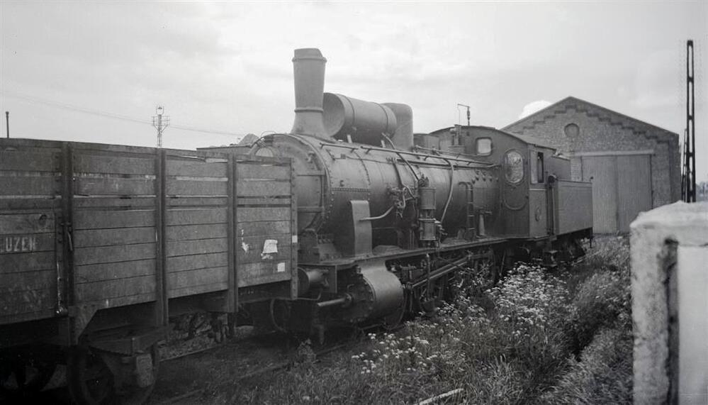 We zien stoomlocomotief nr. 39 in de stelplaats Sint-Niklaas, voor de poorten van de locomtiefloods. Voor de locomotief staat een open goederenwagen van de 'Chemin de fer international de Malines à Terneuzen'.