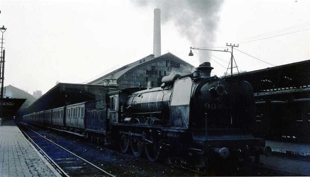We zien een stoomlocomotief van het type 9 (2C Ten Wheel), die de reizigerstrein nr. 4034 sleept. De locomotief heeft een ACFI-voorverwarmer en leiplaten. Op de achtergrond is de perronoverkapping van het oud station Brussel-Noord te zien.