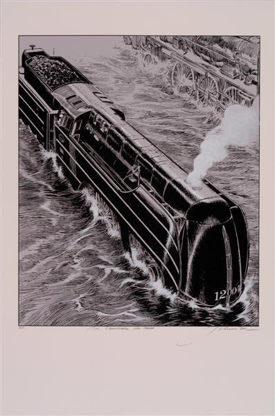 Lithografie van een scène uit het album "De Schoonheid" van François Schuiten. Deze prent toont in vogelperspectief stoomlocomotief 12.004 die het water doorklieft. Op het achterplan doet een stoomlocomotief van een ander type hetzelfde. Deze locomotief werd niet ingekleurd. Op de lithografie werden achteraf enkele lijnen met inkt, potlood en witte verf geaccentueerd. Schenking van François Schuiten.