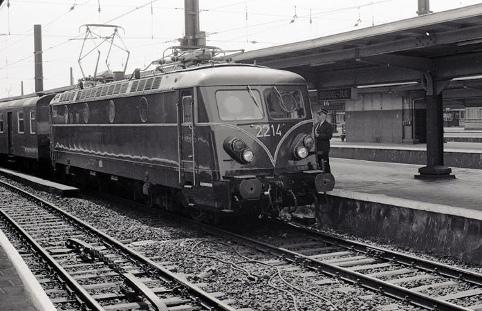 TitelElektrische locomotief 2214 aan het perron van station Brussel-Zuid