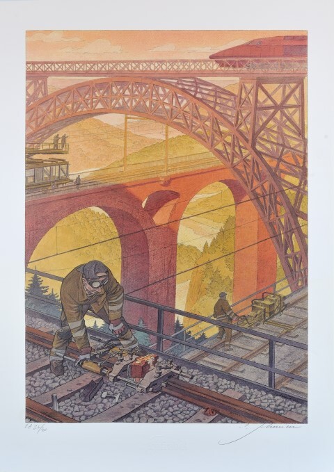 Gekleurde lithografie van vier spoorwegbruggen die boven elkaar werden geplaatst en zo een netwerk vormen. Een spoorleggersploeg is aan het werk. Twee arbeiders op het voorplan voeren werken uit aan de sporen. Op het achterplan werkt de rest van de ploeg op een aangepaste wagen met platform aan de bovenleiding, terwijl één man toekijkt. Op de bovenste brug is rechtsboven de kop van een Thalystrein zichtbaar. Schenking van François Schuiten.