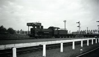 BeschrijvingWe zien stoomlocomotief 7001 van het type 71 (D Eight Coupler) in Zelzate. Zij sleept een goederentrein met platte wagens voorbij een waterkolom. In de achtergrond staat een mechanische seinpaal.