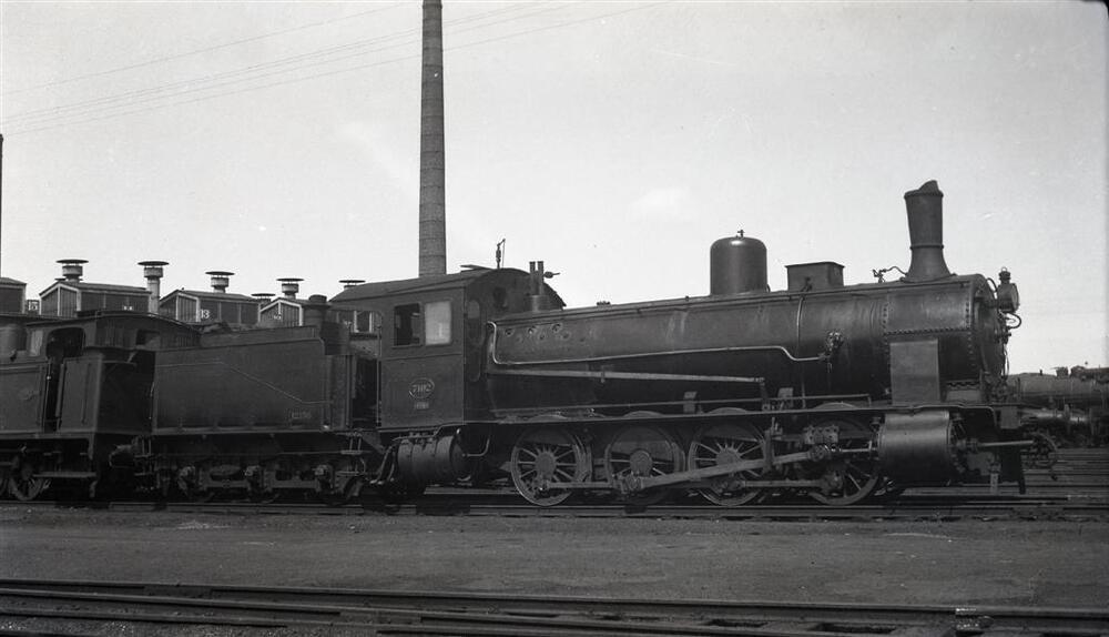 We zien stoomlocomotief 7192 van het type 71 (D Eight Coupler) in de stelplaats Schaarbeek. Zij is gekoppeld aan de tender met nr. 12.156. Achter deze locomotief staat nog een tenderlocomotief van het type 53 (Dt). In de achtergrond zien we de locomotiefloods en een hoge schoorsteen.