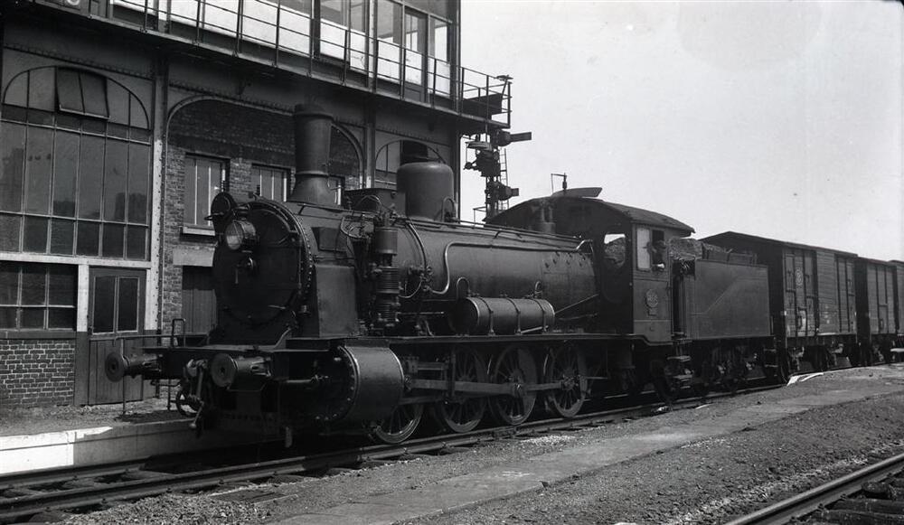 We zien stoomlocomotief 7294 van het type 72 (D Eight Coupler) in Gent-Sint-Pieters. De locomotief is gekoppeld aan de tender met nr. 12.228 en staat klaar om een goederentrein te slepen. Zij staat naast de seinpost van het station.