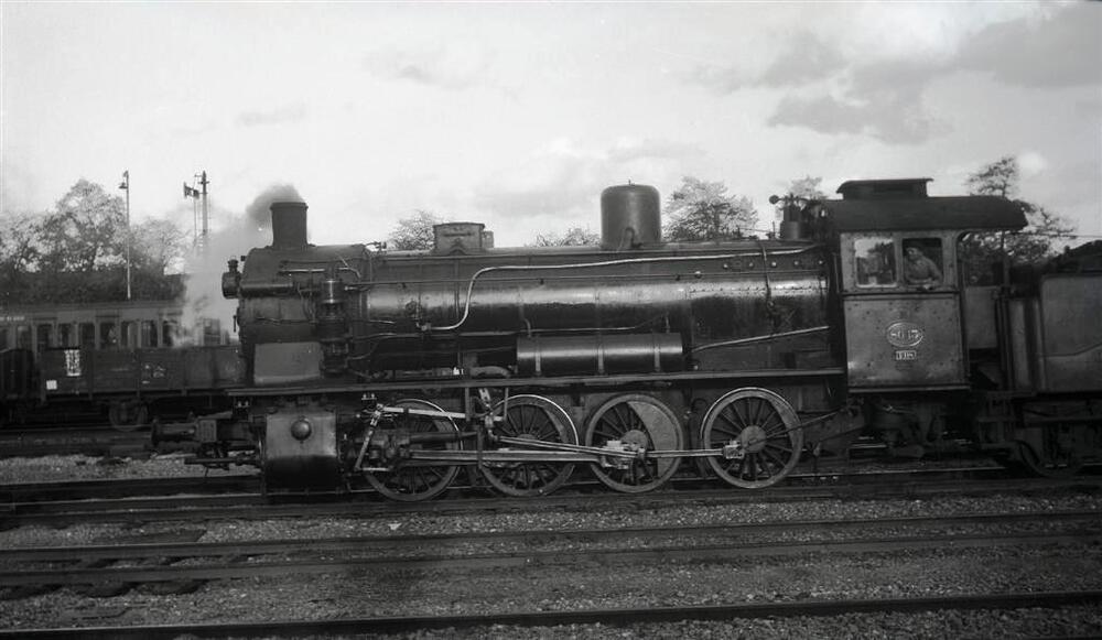 BeschrijvingWe zien stoomlocomotief 8045 van het type 80 (D Eight Coupler). De machinist kijkt uit het raam van het machinistenhuis.