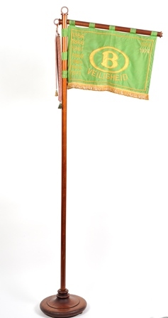 Groene vlag met gele franjes aan een houten staander. Op de vlag staat in het midden het NMBS-logo met daaronder het opschrift 'veiligheid'. Naast het logo staan de jaartallen 1956, 1960, 1961, 1963, 1964, 1966, 1972, 1973 en 1976.