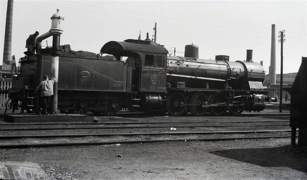 BeschrijvingWe zien stoomlocomotief 8080 van het type 80 (D Eight Coupler) aan de waterkolom in de stelplaats Maastricht. Zij is gekoppeld aan de tender met nr. 6051.