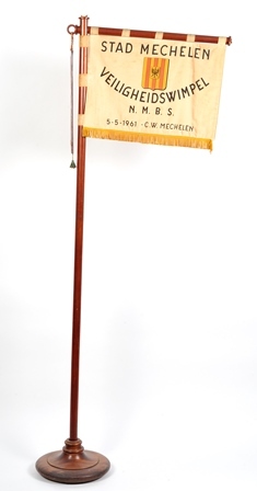 Witte vlag met gele franjes aan een houten staander. Op de vlag staat in het midden het wapenschild van de stad Mechelen. Daarboven het opschrift 'stad Mechelen' en onder het wapen 'veiligheidswimpel N.M.B.S. 5-5-1961 C.W. Mechelen'. Bovenaan de vlag hangt nog een kleine bruine vaandel met kwast waar 'Mechelen 1961' op staat.