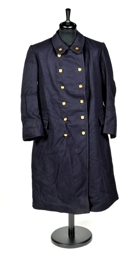 Deze wollen overjas heeft een dubbele rij koperkleurige knopen, twee steekzakken en spoorweginsignes op de revers. De knopen zijn versierd met een afbeelding van het gevleugeld en gekroond wiel. Binnenin bevindt zich een borstzakje.