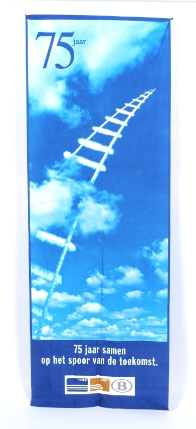 Banner die voor de 75e verjaardag van de NMBS werd vervaardigd. We zien een blauwe hemel met enkele witte wolken. Tussen de wolken loopt een witte spoorlijn naar de horizon. In de linkerbovenhoek staat '75 jaar'. Onderaan bevindt zich een blauwe band waar de titel, het NMBS-logo en het logo voor 75 jaar NMBS in staan. De banner heeft velcro stroken aan de boven- en onderkant.