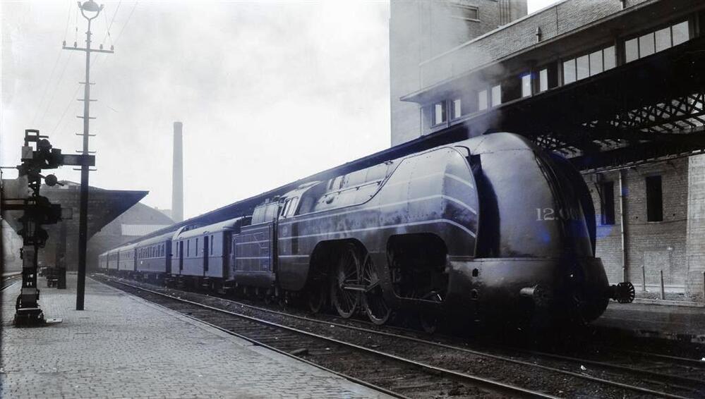 Stoomlocomotief van het type 12 (2B1 Atlantic) van de stelplaats Schaarbeek (FSR). De locomotief sleept de Nord Express naar Oostende. Deze trein is samengesteld uit 10 rijtuigen. Op het perron is de luifel, een mechanische seinpaal en een lantaarnpaal zichtbaar. Op de achtergrond zien we ook de sporenhal van het oude station Brussel-Noord. Rechts zien we het nieuwe station in aanbouw.