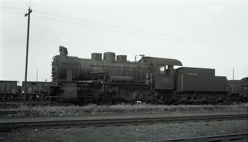 BeschrijvingWe zien stoomlocomotief 8576 van het type 81 (D Eight Coupler) in de stelplaats Muizen. Zij is terzijde gesteld. In de achtergrond zien we een gesloten wagen met nummer 53499.