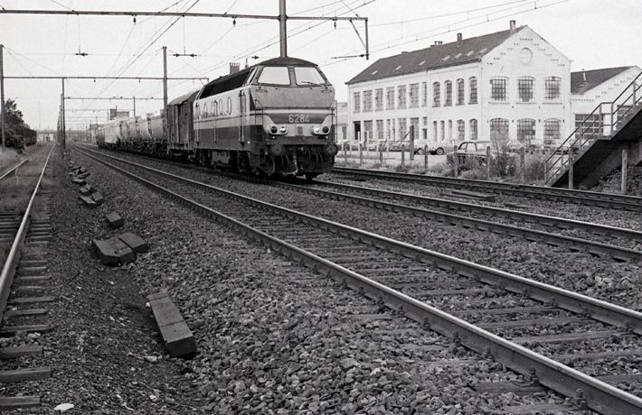 BeschrijvingDiesellocomotief 6284 sleept enkele goederenwagens.