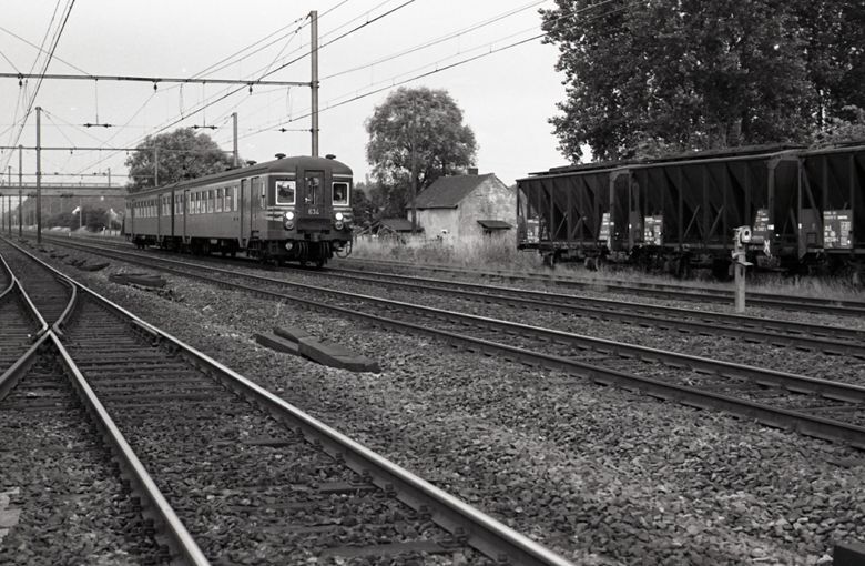 BeschrijvingRechts van het tweeledig motorstel bemerken we enkele goederenwagens.