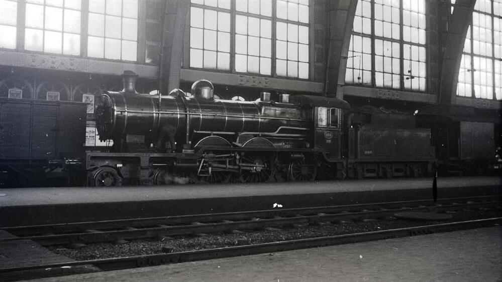 Stoomlocomotief van het type 6 (2B1 Atlantic) onder de perronkap van het station Antwerpen-Centraal. Achter de locomotief is een GCI bagagerijtuig gekoppeld. Op het naastliggende spoor staat een gesloten goederenwagen. Op de voorgrond zien we sporen en het perron.