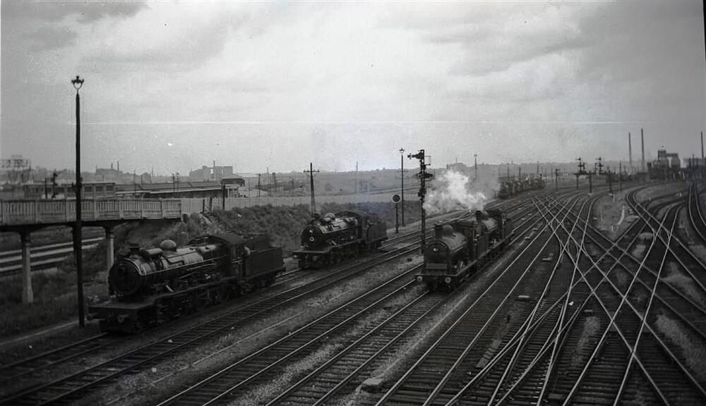 We zien van links naar rechts twee stilstaande stoomlocomotieven type 7 (2C Ten Wheel) en twee stoomlocomotieven type 41 (C Bourbonnais) in doorrit te Schaarbeek. De foto is genomen op de brug over de wisselstraat naar de rijtuigenwerkplaats. Ook is de mechanische seininrichting en enkele lantaarnpalen zijn duidelijk zichtbaar.