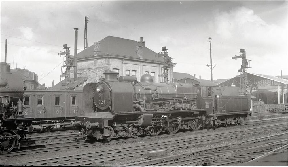 We zien een stoomlocomotief van het type 7 (2C Ten Wheel) in Luik-Guillemins. Op de achtergrond is een dienstgebouw zichtbaar en een GCI-rijtuig. De mechanische seininrichting en verlichtingspalen zijn eveneens duidelijk aanwezig.