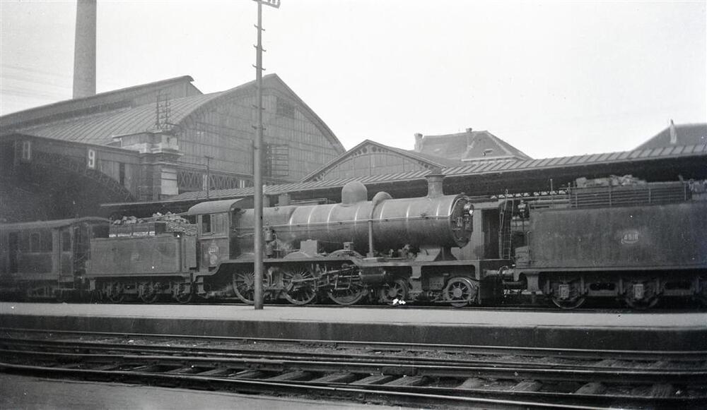 We zien stoomlocomotief 3351 van het type 8 (2C Ten Wheel) in het station Brussel-Noord. Daarvoor staat locomotief 4516. Het perron en de overkapping zijn duidelijk zichtbaar.