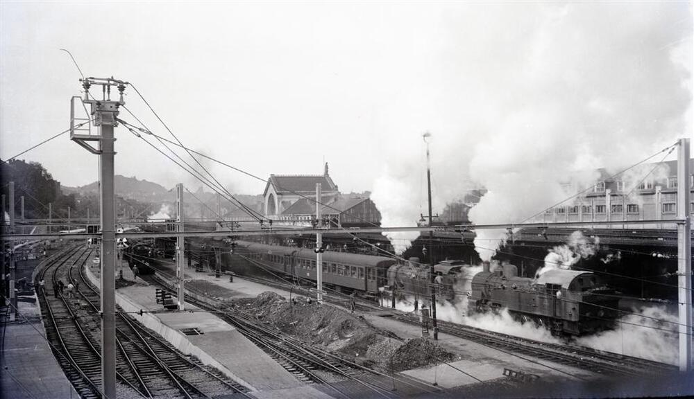 We zien tenderlocomotieven 98.035 en 98.005 van het type 98 (Et) in het station Luik-Guillemins. Zij zullen de reizigerstrein nr. 1329, samengesteld uit K 1-rijtuigen, het hellend vlak opdrukken. De elektrische bovenleiding is reeds aanwezig op deze lijn. De heraanleg van de perrons en sporen is volop bezig. Op de achtergrond is het stationsgebouw uit 1863 nog zichtbaar net voor zijn sloping.