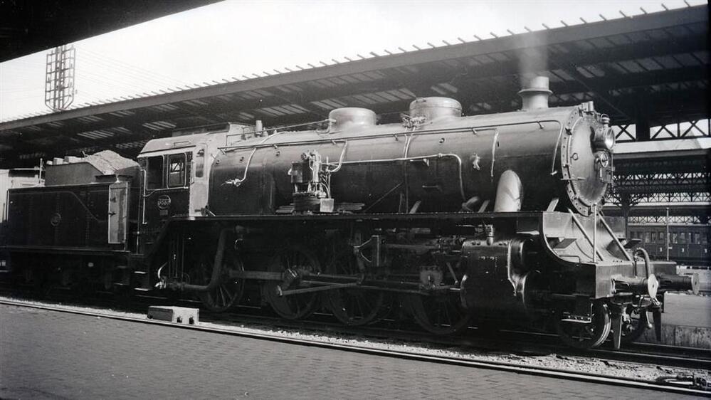 We zien een stoomlocomotief van het type 38 (1D Consolidation). De locomotief is nog niet voorzien van windleiplaten. We hebben zicht op de perrons en de luifels. Op de achtergrond staat een GCI-rijtuig.