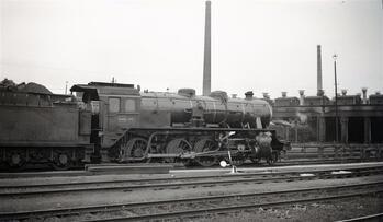 BeschrijvingZijaanzicht op een stoomlocomotief van het type 38 (1D Consolidation). Verder zien we een deel van de locomotiefloods, een wisselhendel, een lantaarnpaal en enkele schoorstenen van de werkplaats.