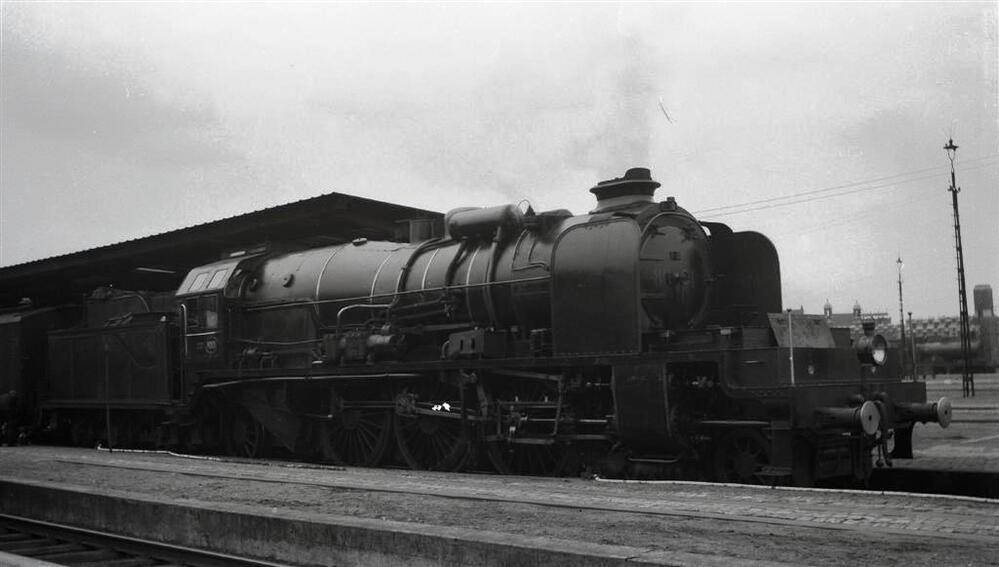 BeschrijvingZicht op een stoomlocomotief met windleiplaten van het type 10 (2C1 Pacific). Op de achtergrond het perron, enkele verlichtingspalen en in de verte het stationsgebouw.
