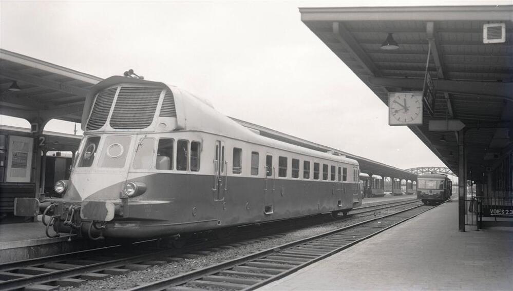 BeschrijvingOp deze foto zien we een motorwagen van de Franse spoorwegen (SNCF) aan het perron in station Doornik. Op de achtergrond bemerken we een motorwagen van het type 554 van de Belgische spoorwegen (NMBS).