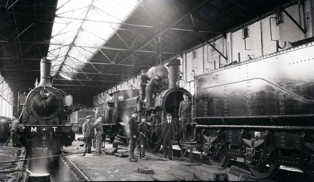 BeschrijvingOp deze foto zien we het interieur van de werkplaats in Sint-Niklaas. Het personeel poseert op en naast enkele stoomlocomotieven.