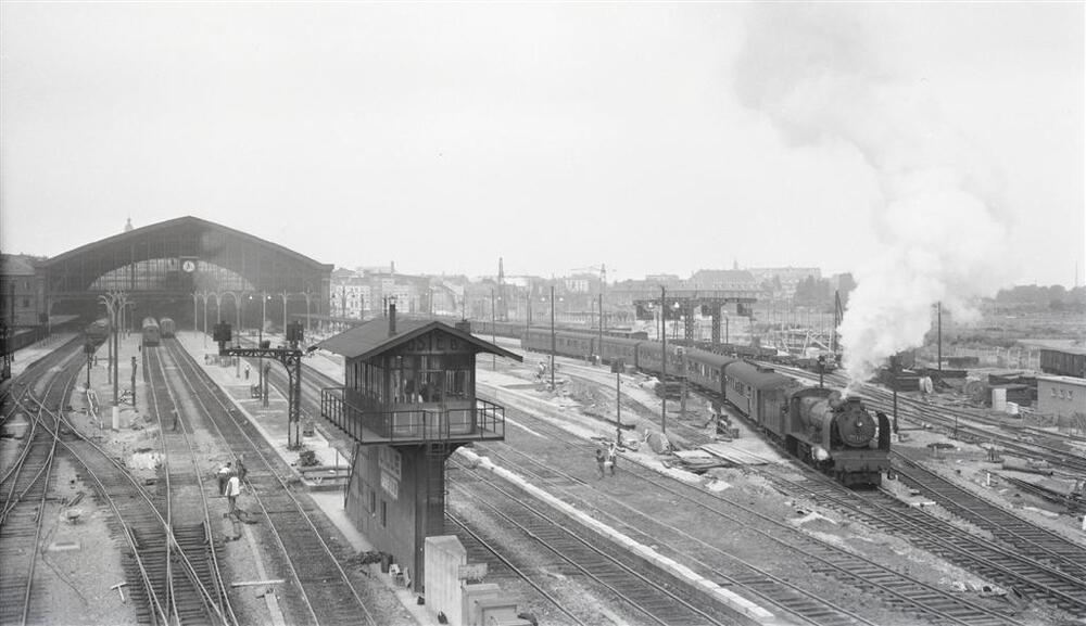 Deze foto biedt een zicht op de sporenbundel met op de achtergrond de sporenhal van het station. Rechts zien we een reizigerstrein, gesleept door stoomlocomotief 7.061 van het type 7 (2C Ten Wheel). De trein is juist vertrokken uit Rijsel richting Antwerpen-Centraal. Vooraan zien we ook het seinhuis, dat tussen de sporen is gebouwd om zo beter het treinverkeer te kunnen volgen.