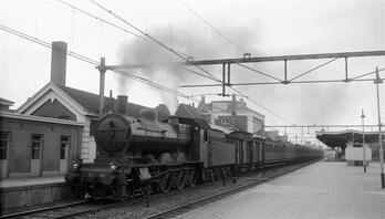 BeschrijvingOp deze foto zien we een stoomlocomotief van het type 3700 van de Nederlandse spoorwegen. Links het stationsgebouw en rechts het perron.
