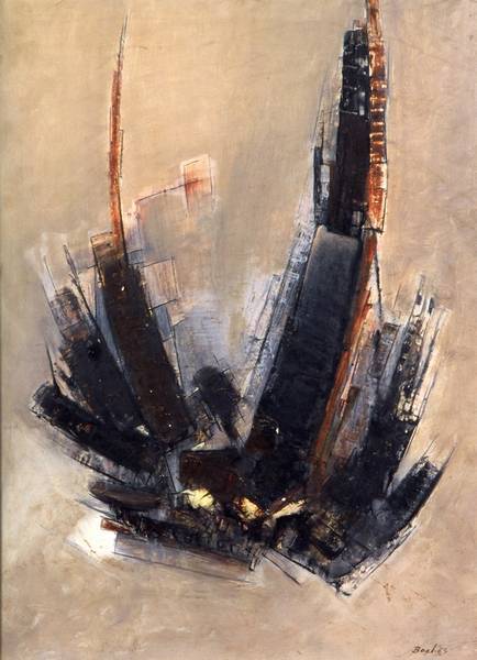 Non-figuratieve compositie van lijnen en vlakken in zwart en bruin op een beige achtergrond