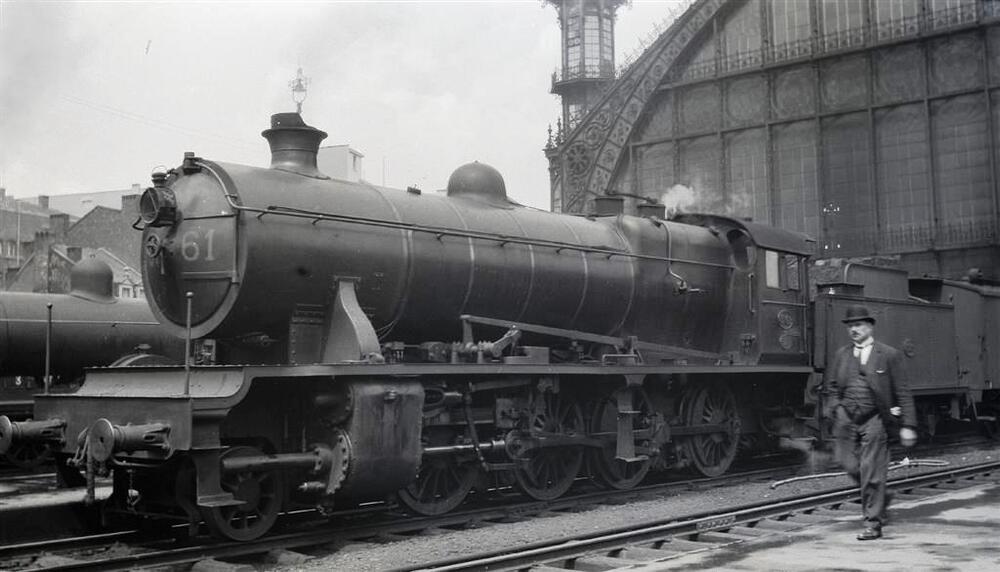 We zien een stoomlocomotief van het type 31 (1D Consolidation) met op de achtergrond de stationsoverkapping, geflankeerd door een verdwenen hoektoren. Over het perron stapt een man met een bolhoed.