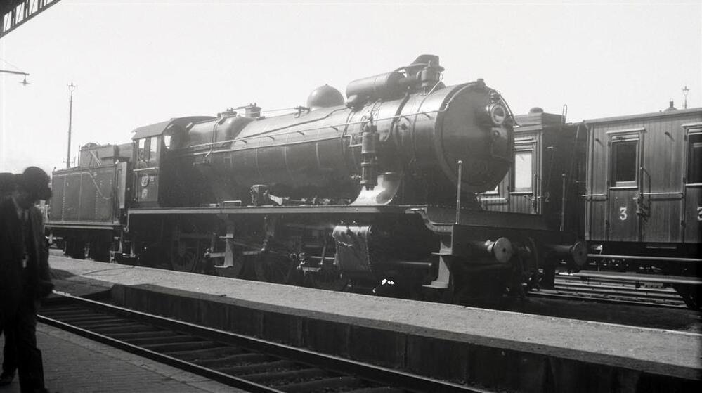 BeschrijvingStoomlocomotief van het type 33 (1D Consolidation) langs het perron, met op de achtergrond enkele GCI-rijtuigen tweede en derde klas.