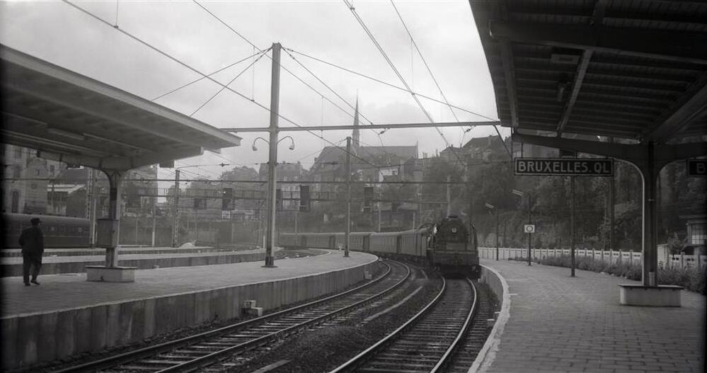 Op de foto zien we stoomlocomotief 10.011 van het type 10 (2C1 Pacific) in station Brussel-Leopoldswijk. Zij komt aan op spoor 1 vanuit Luxemburg, met de trein nr. 403 die bestaat uit K-rijtuigen. Boven de sporen hangt een brug met lichtseinen.