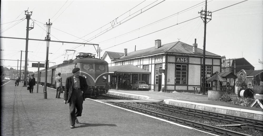 Op de foto zien we elektrische locomotief 122.046 van het type 122 (BoBo) voor het oude stationsgebouw van Ans. Deze trein, samengesteld uit K-rijtuigen is de reizigerstrein nr. 908 Brussel - Luik. Bemerk de karakteristieke lantaarnpaal die op het perron staat.