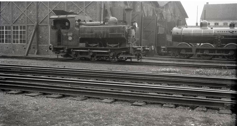 BeschrijvingWe zien een stoomlocomotief van het type 51 (Ct) naast de locomtiefloods. Voor de poorten van de loods staat ook een stoomlocomotief van het type 41.