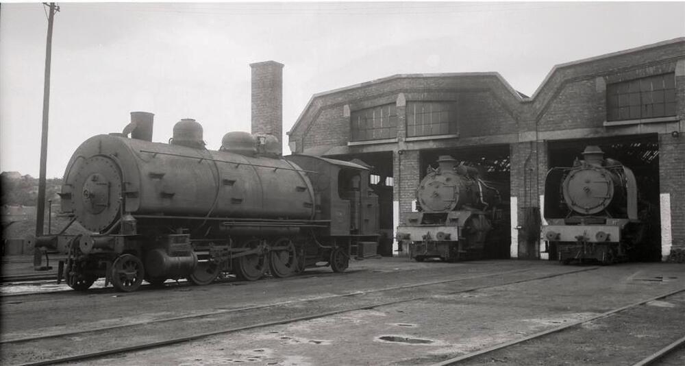 Zicht op een stoomlocomotief van het type 57 (1C1t) voor een locomotiefloods van de werkplaats van Salzinnes. In de loods staan ook nog twee stoomlocomotieven van het type 7(2C Ten Wheel).