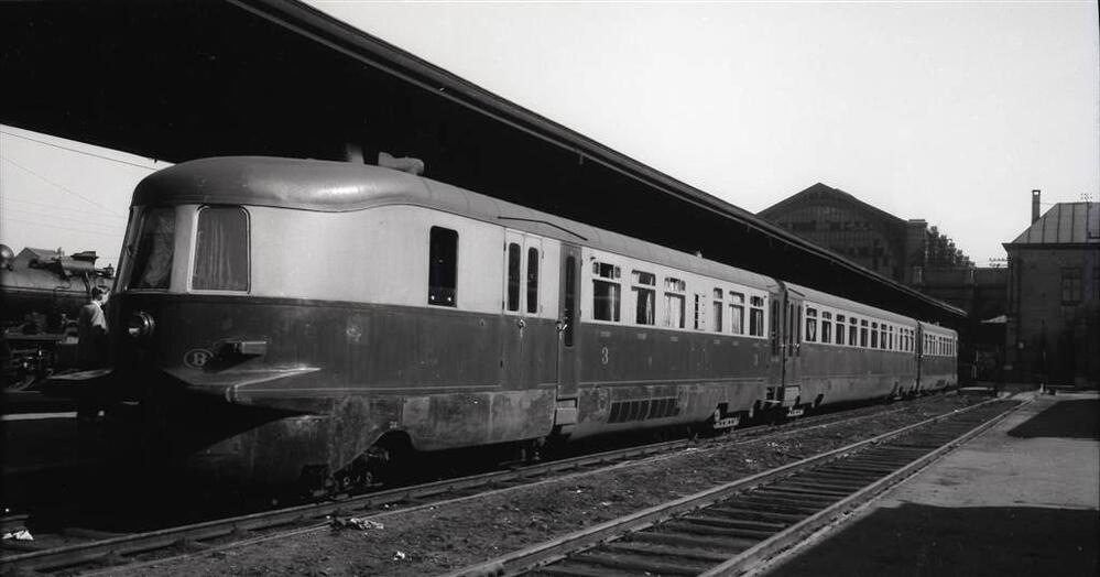 Op deze foto zien we een motorstel van het type 670 (ex-type 653.1). Dit motorstel staat gereed om de reizigers naar Erquelinnes te vervoeren. Op het rijtuig zien we de aanduiding voor derde klas. Op de achtergrond is ook de sporenhal van het toenmalige kopstation Brussel-Zuid te zien.